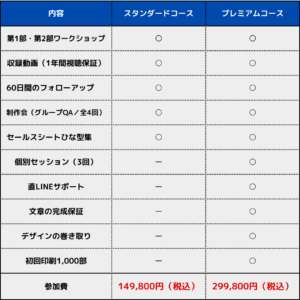 最小限の負担でサービスメニューとセールスシートが完成する、プレミアムコースの金額は299,800円(税込)です。こちらの定員は1名限りです。