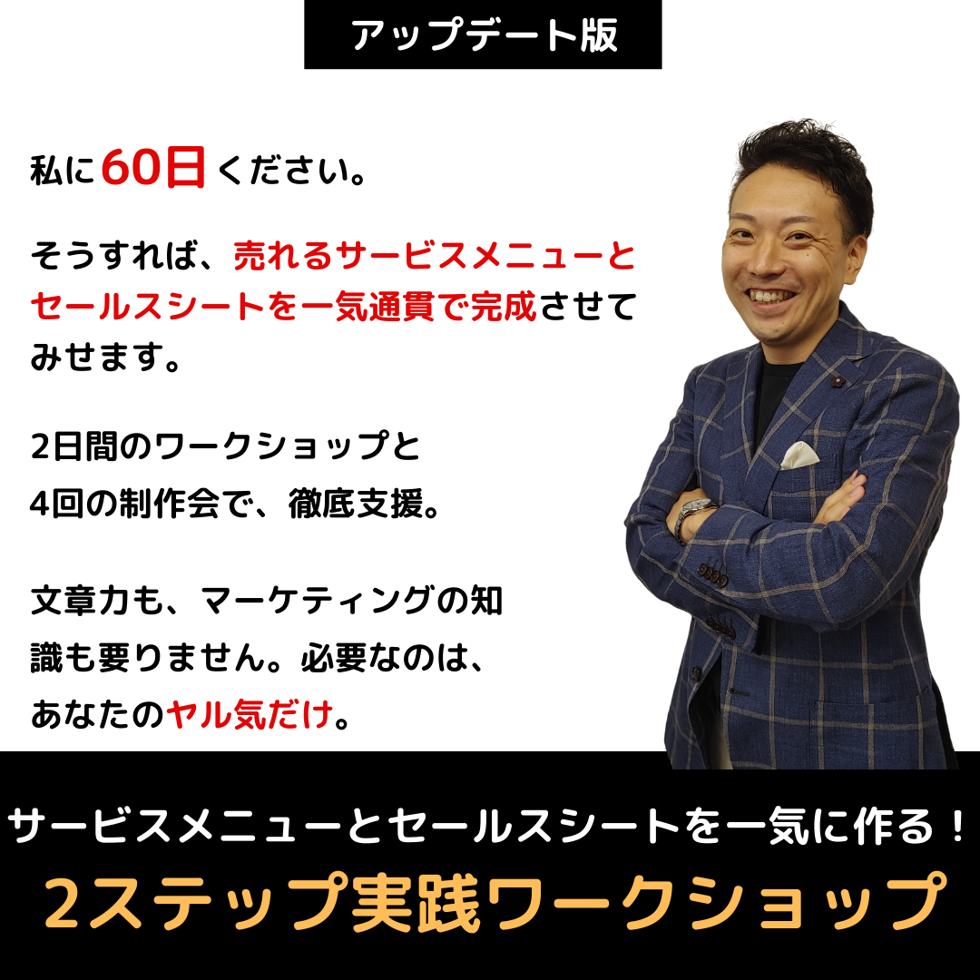 それを解決するのが、今からご案内する『サービスメニューとセールスシートを一気に仕上げる!2ステップ実践ワークショップ』です。