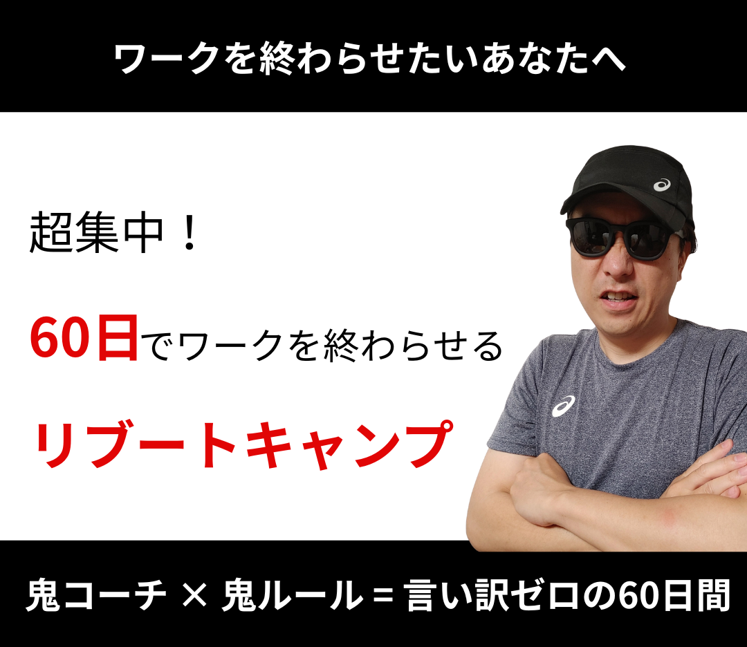 ワークをやりきるための仕組み・・・それが『超集中60日オンライン・リブートキャンプ』。あなたがワークを完遂するための60日間集中プログラムだ。